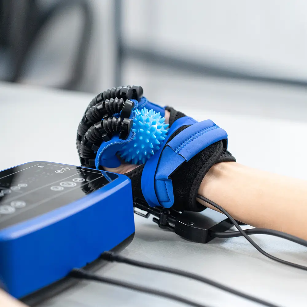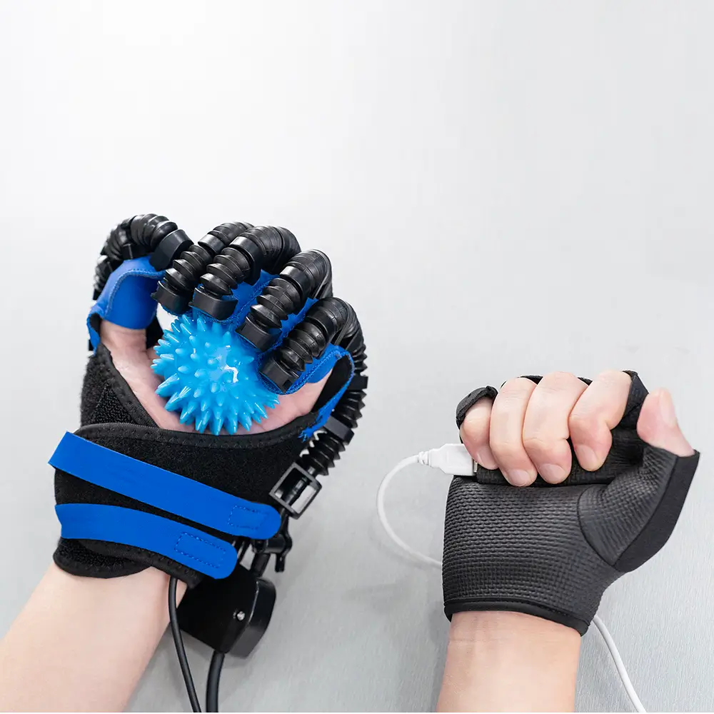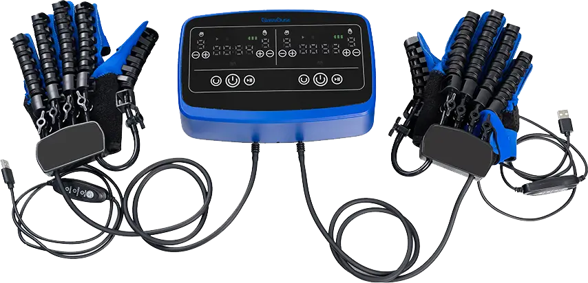 Wear the mirror glove on the healthy hand and the power glove on the affected hand. Place the provided training ball in the affected hand, then press the button on the palm of the mirror glove to initiate synchronized grasping movements.