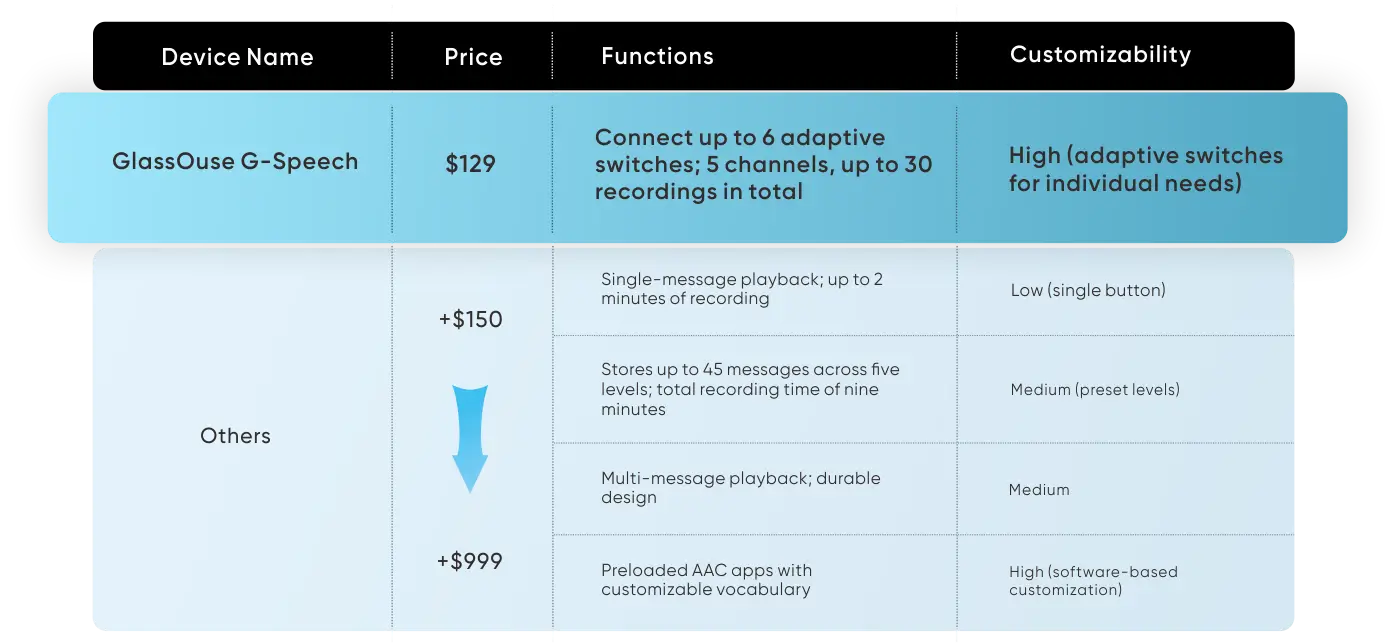 Unlike traditional speech recorders, the GlassOuse G-Speech is designed with customization in mind. Its ability to connect with multiple adaptive switches offers greater flexibility for users with diverse physical needs. Whether used at home, in therapy sessions, or educational settings, this device empowers individuals to communicate effectively without unnecessary complexity or high costs.